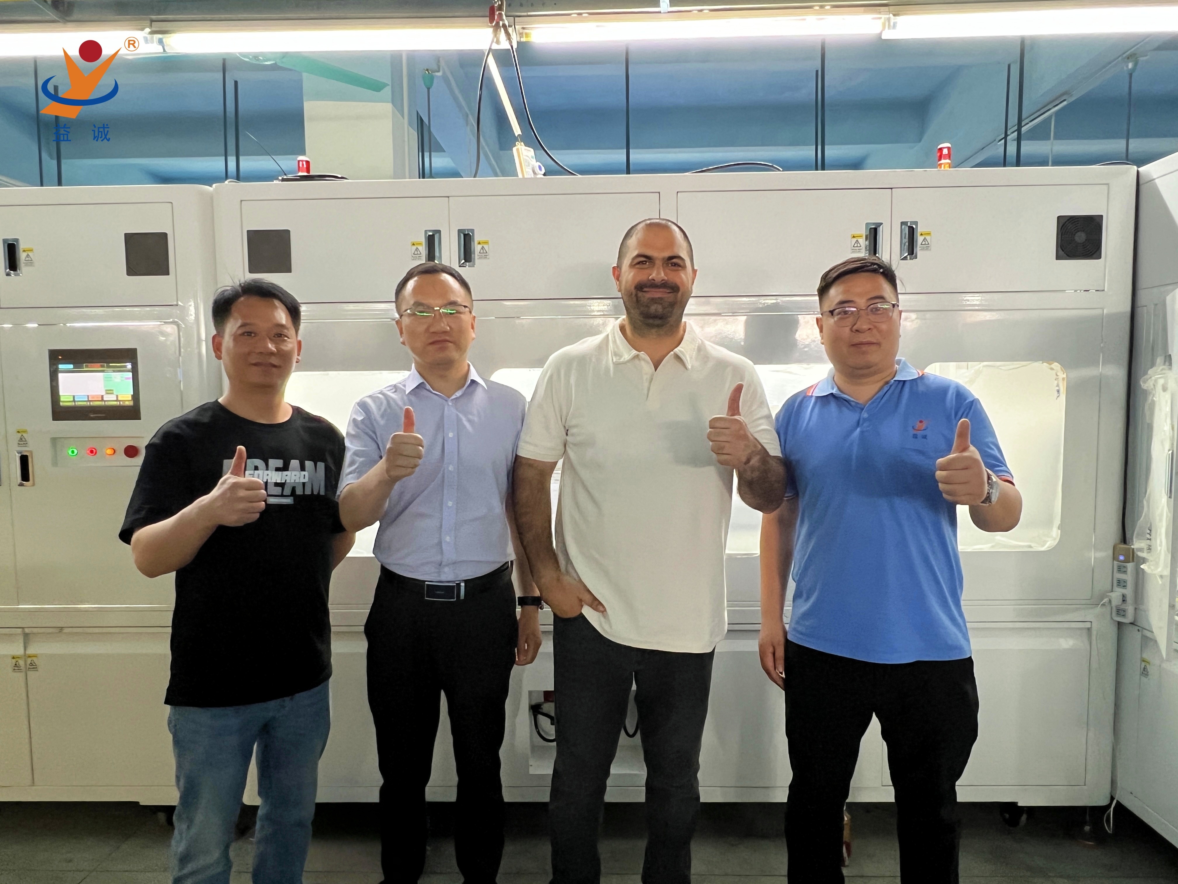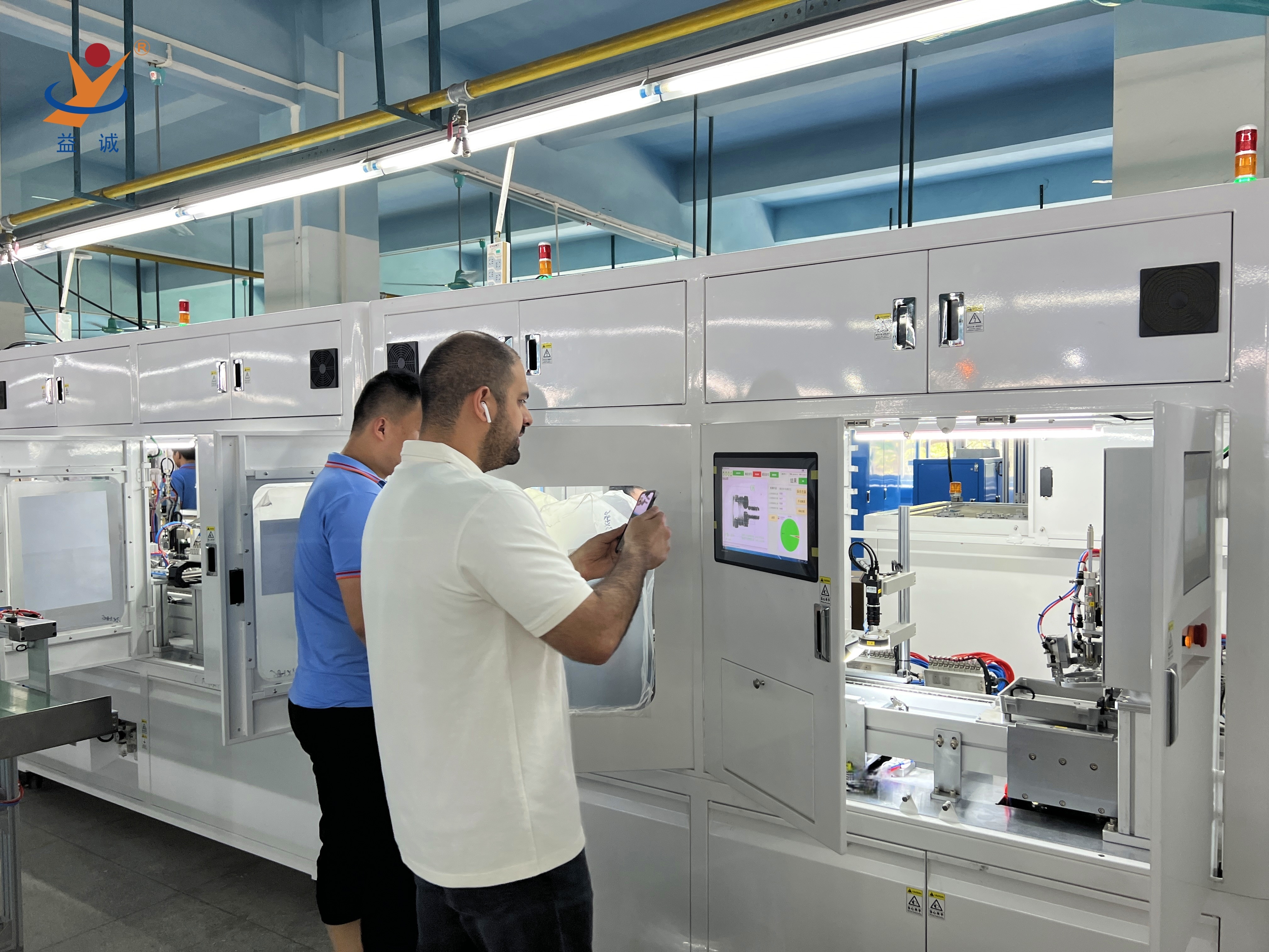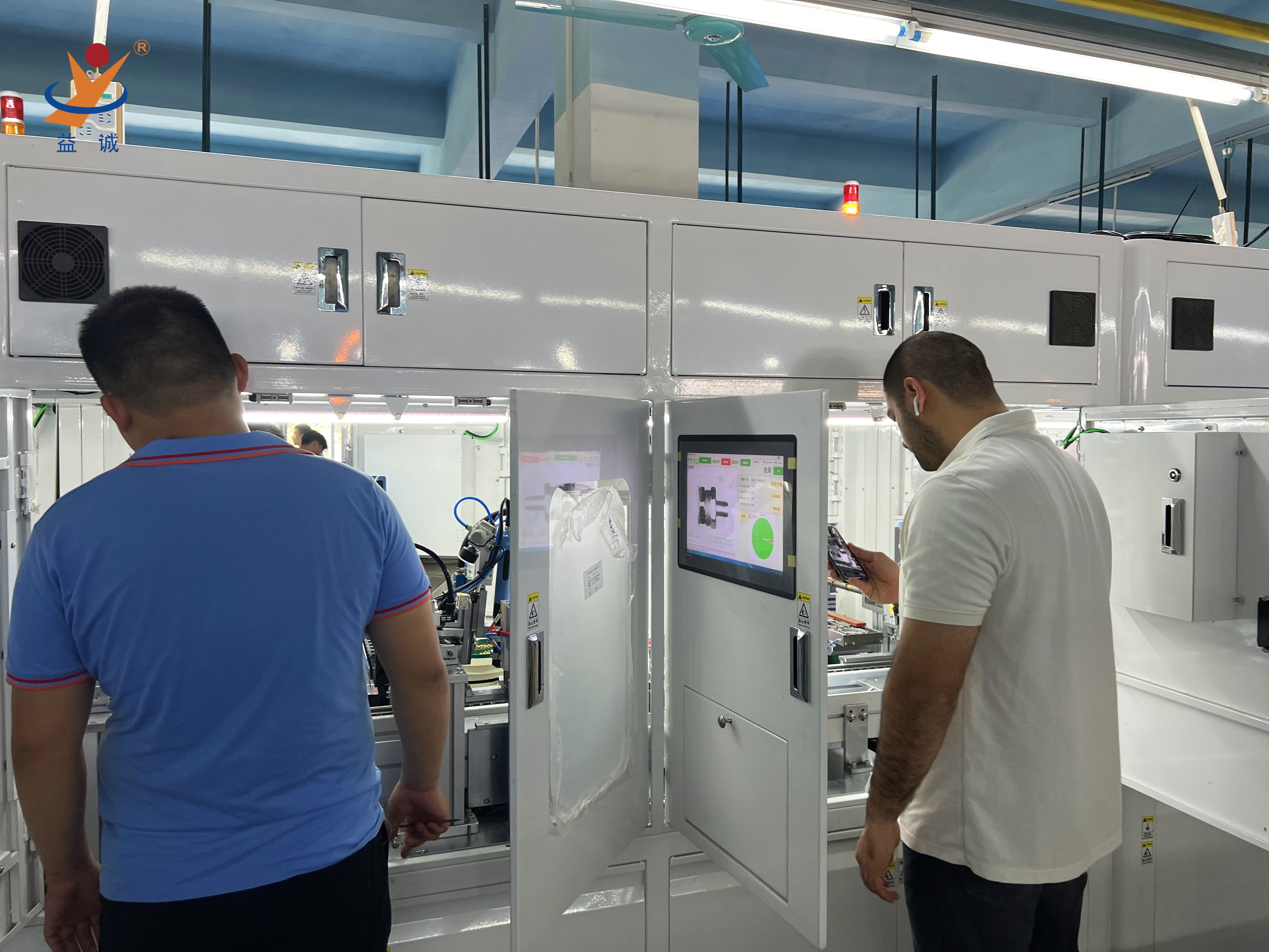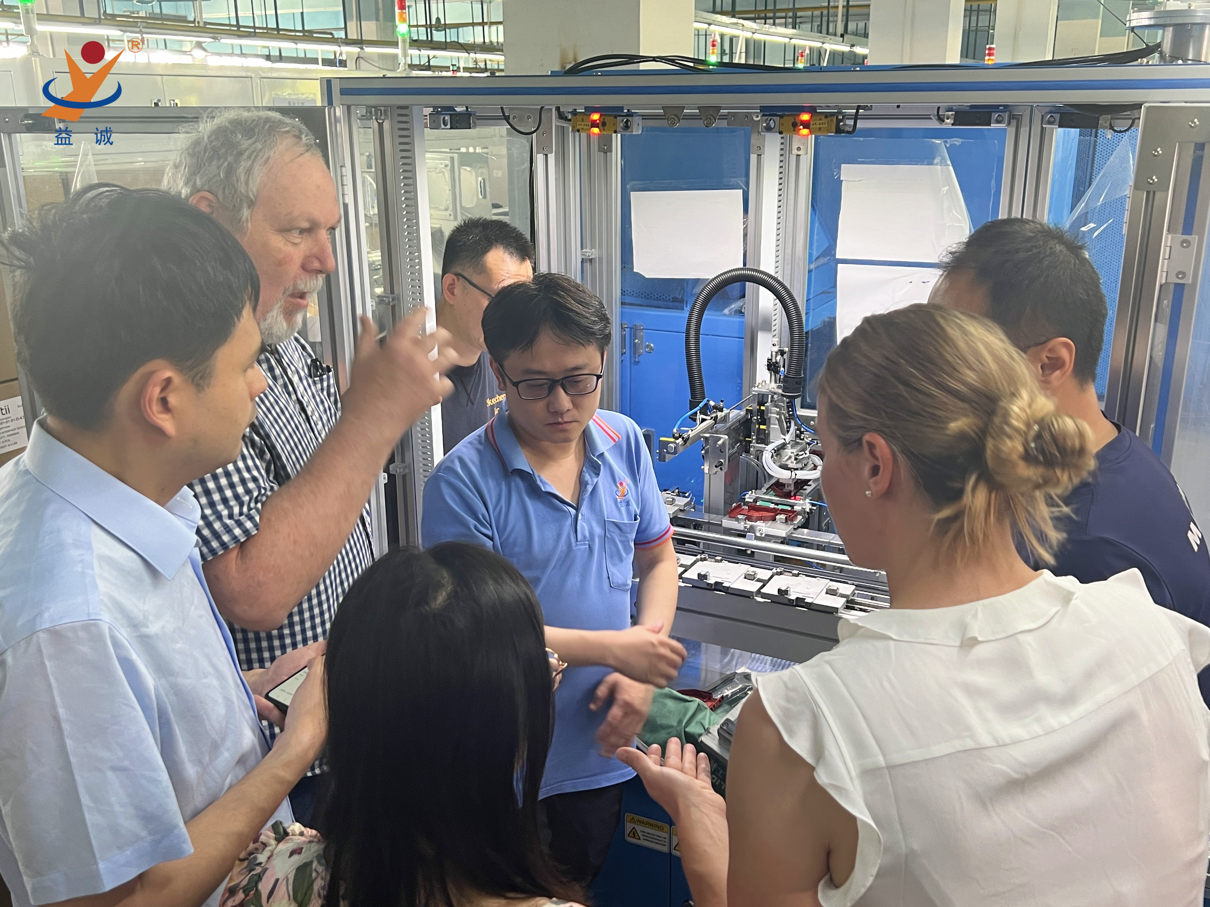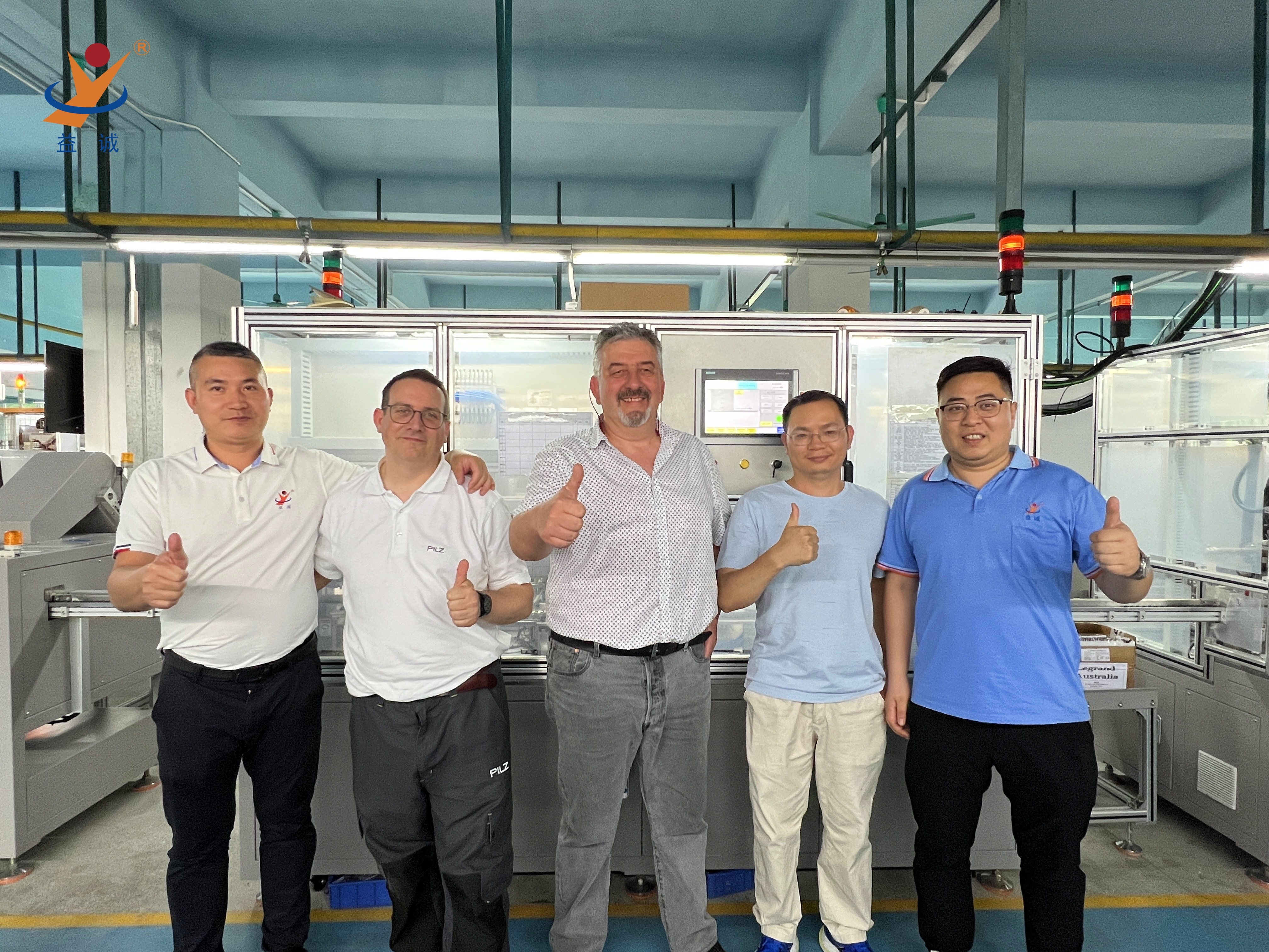 来自法国的客户团队正在现场对高端智能低压电器自动化生产线进行细致地验收,该种类设备是九州酷游的实力产品之一,是集合高智能、高精度、高产能与实时数据化检测系统等高端技术于一体的高科技自动化生产线。